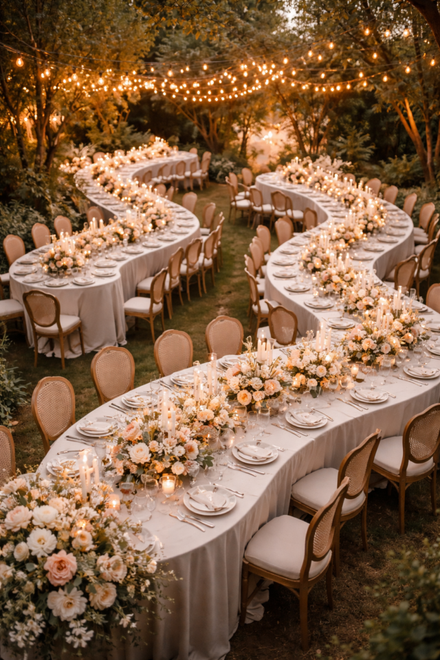 Serpentine Tables – also geschwungene Tischformen – sorgen für Bewegung und Nähe zwischen den Gästen .