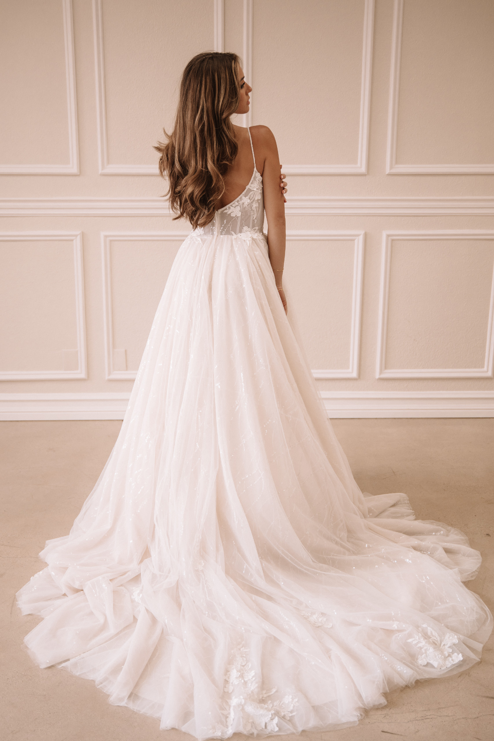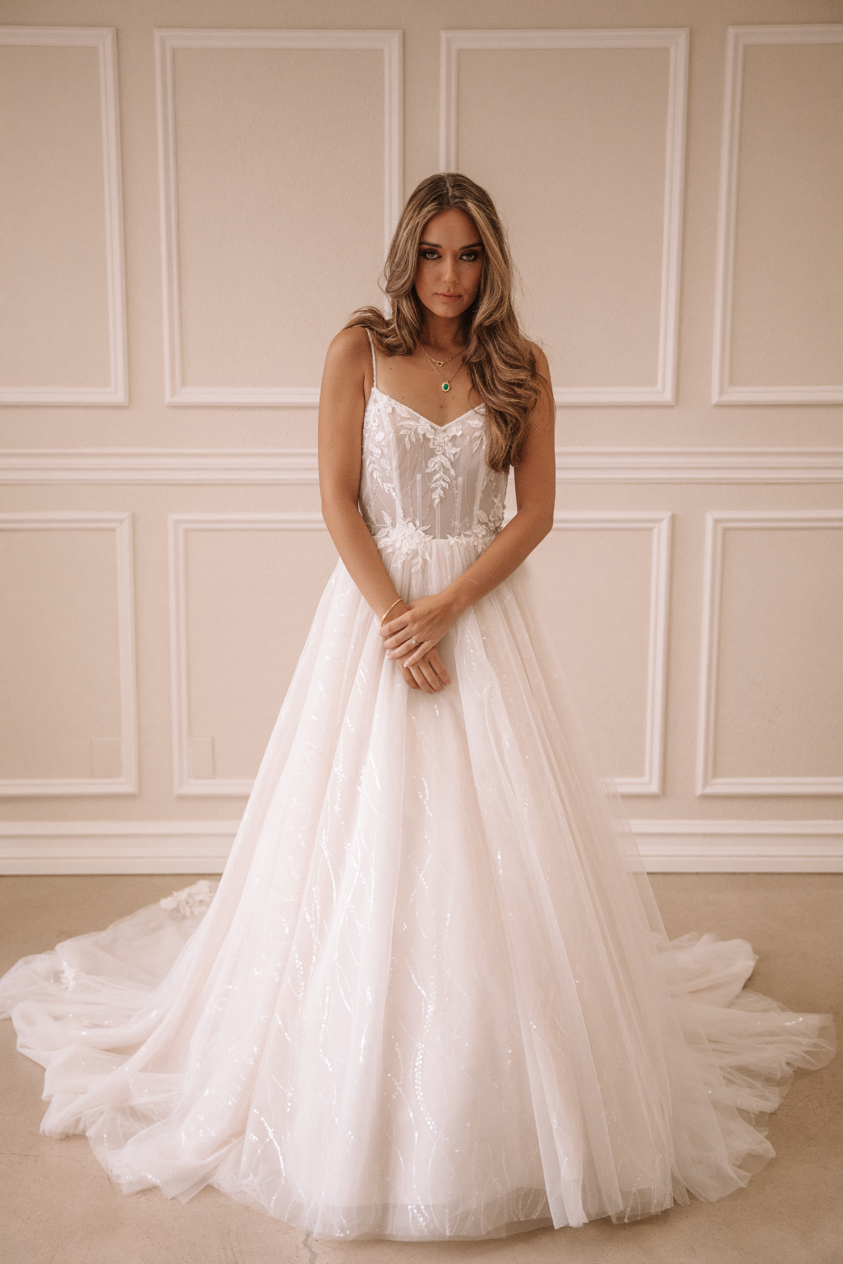 Die zarten Spaghettiträger geben dem Kleid eine Leichtigkeit, die perfekt für Bräute ist, die sich frei und unbeschwert fühlen möchten. Gleichzeitig bringt der edle Schnitt eine Prise Eleganz mit, die „Isabelle“ zu einem echten Statement macht.