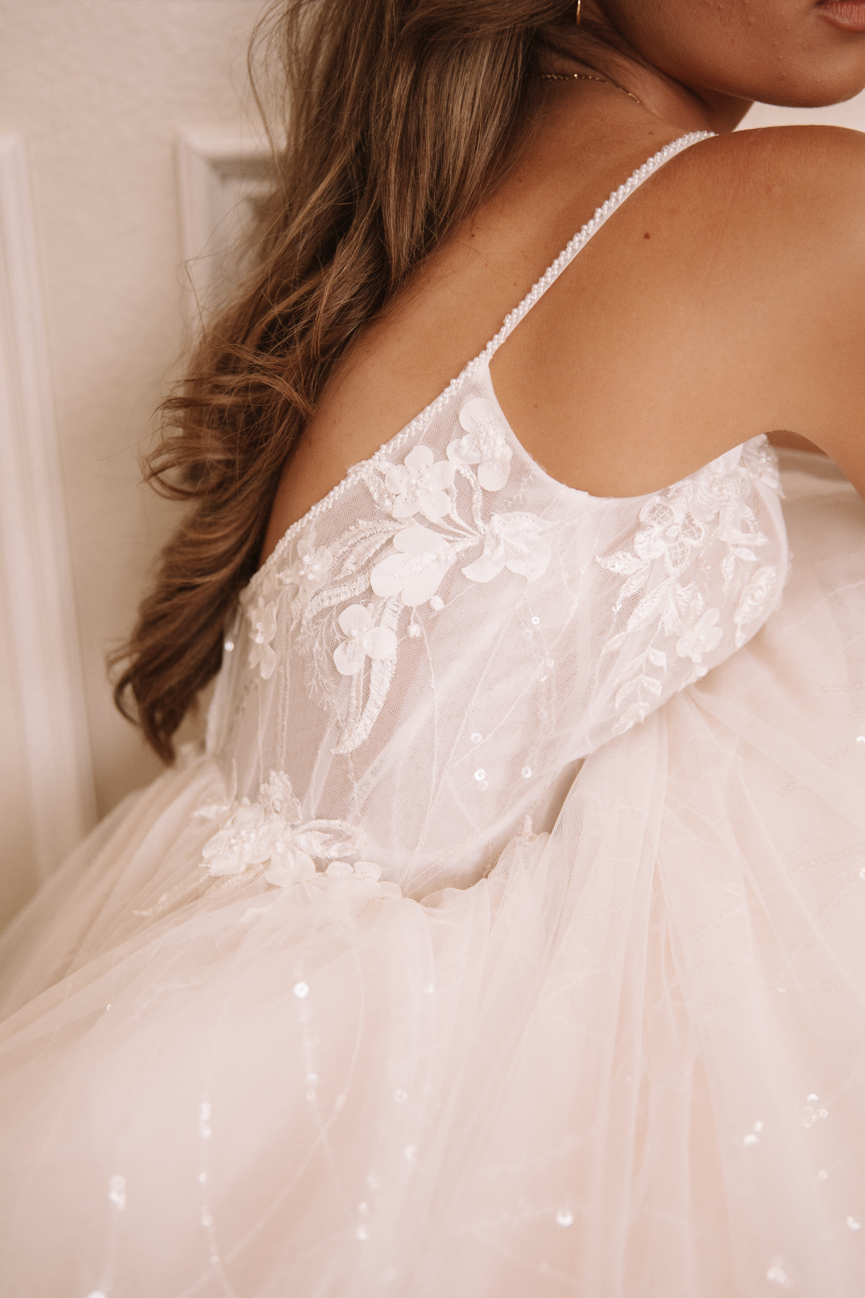 Ein Kleid wie ein Traum! „Isabelle“ verzaubert mit ihrem zarten Tüllrock, der bei jedem Schritt elegant mitschwingt und mit feinem Glanzlicht durchzogen ist – wie kleine funkelnde Wellen im Stoff. Das Oberteil ist mit feiner Spitze verziert, die sich wie Blätter und Blüten über das transparente Korsage-Design legt und für eine wunderschöne, feminine Silhouette sorgt.