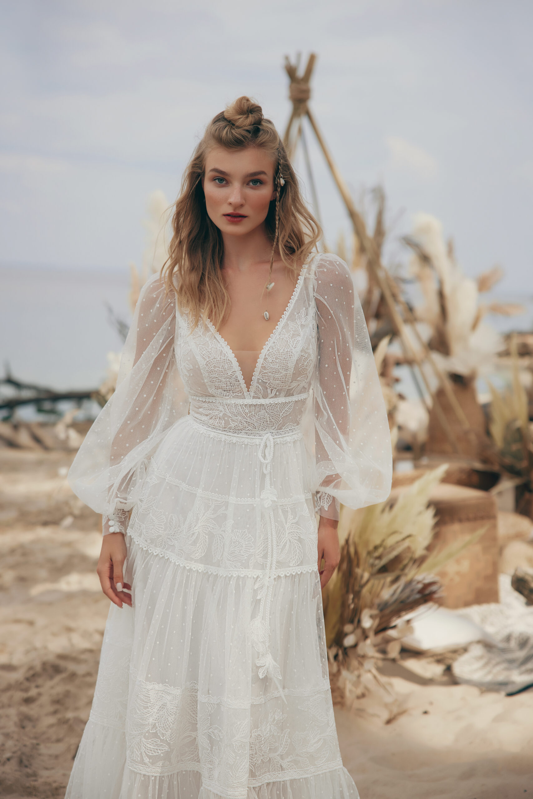 Boho Brautkleid mit Ärmeln und Pünktchenspitze von Ariamo Boho