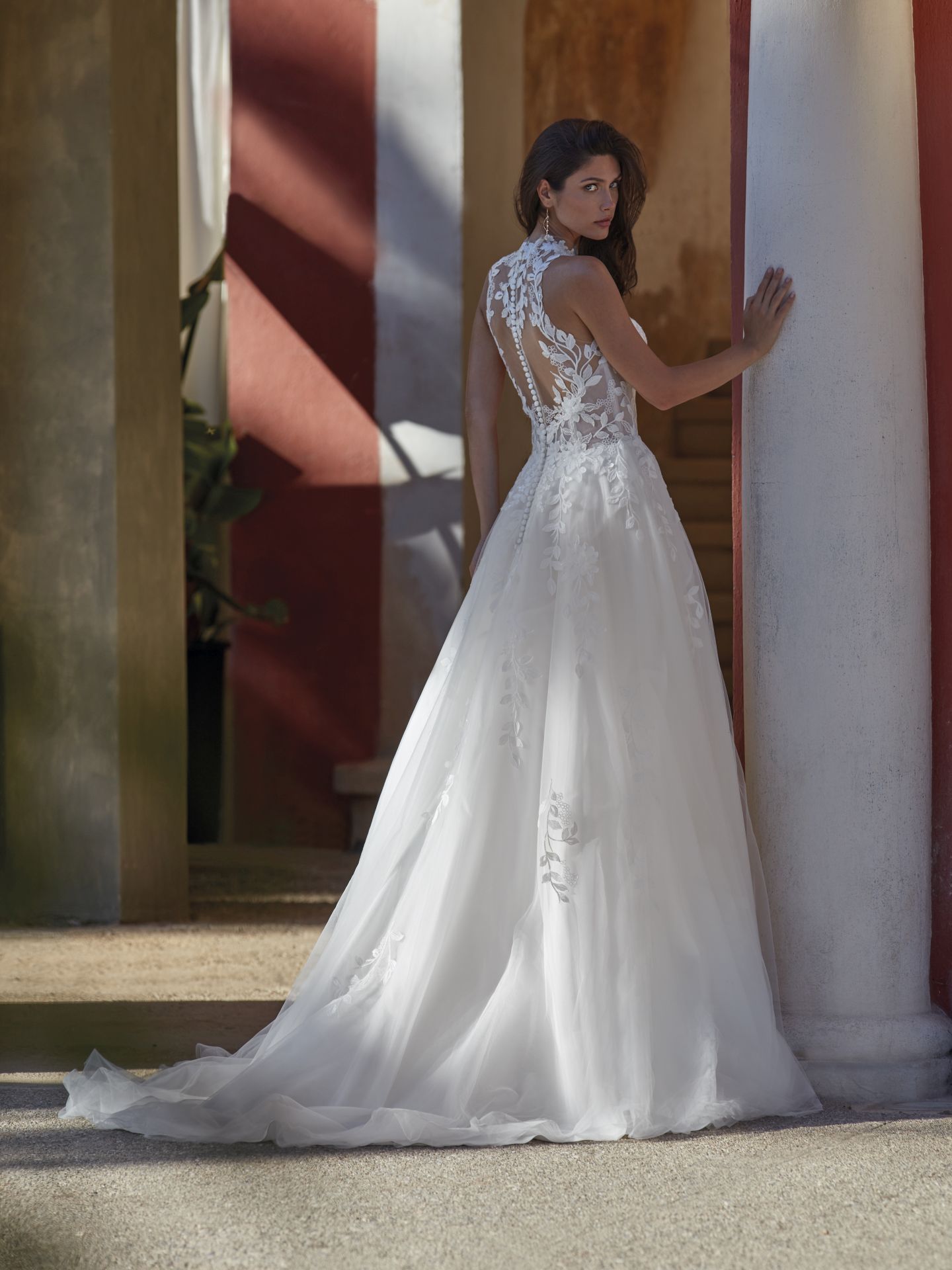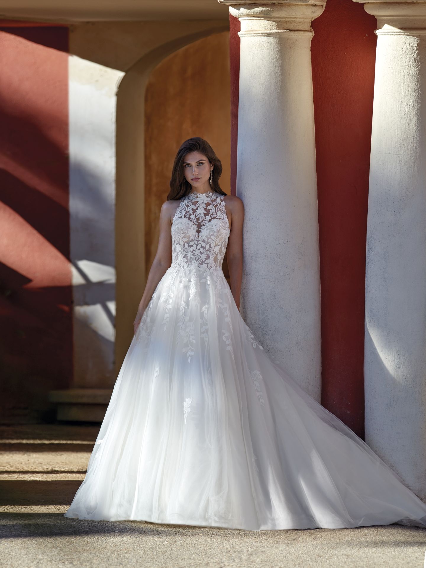 Hochgeschlossenes A-Linien Brautkleid mit Neckholder Top und zarter Blätterspitze, welche bis in den Rock hinein läuft. Kleine 3D Applikationen verleihen de Kleid das besondere Etwas.