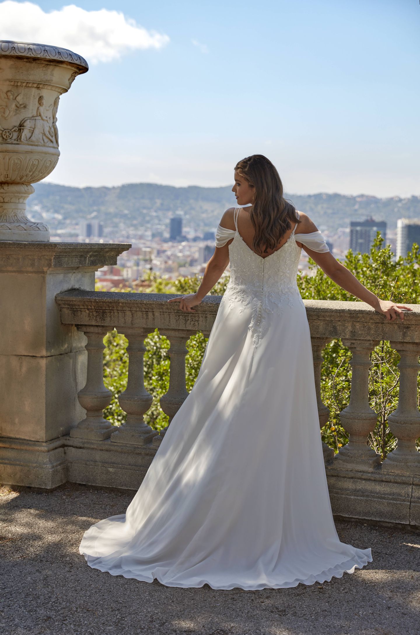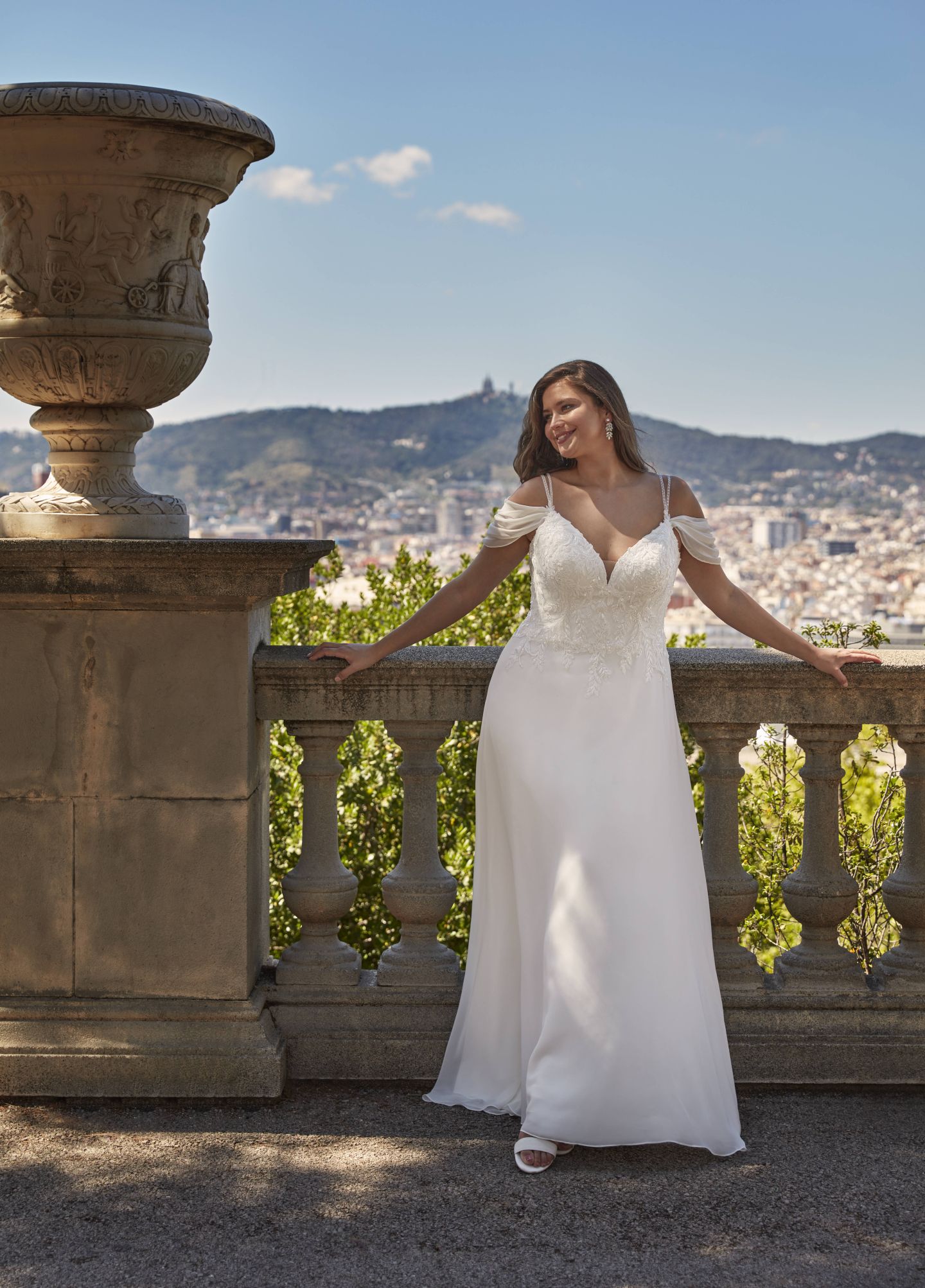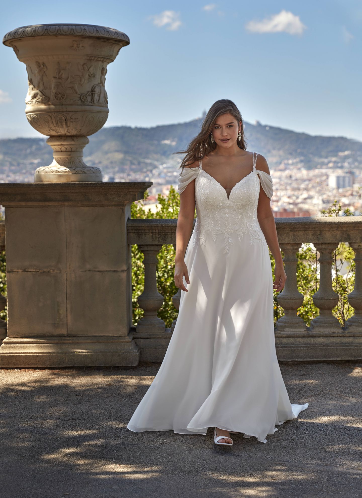 Sarah ist ein wunderbares Beispiel dafür, dass auch Curvys Brautkleider aus fließendem Chiffon tragen können. Diese A-Linie umspielt mit seinen leichten Trägerchen die zarten Spaghettiträger. Der Ausschnitt ist relativ dezent gehalten und die kleinen Spitzenapplikationen gehen vom Oberteil bis in den Rock hinein. Eine sehr dezente Schleppe rundet das ganze ab.